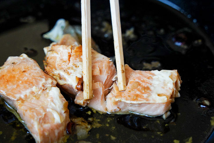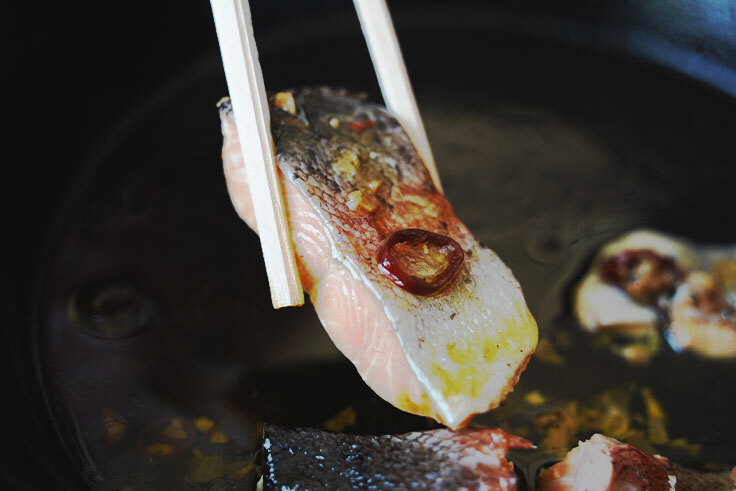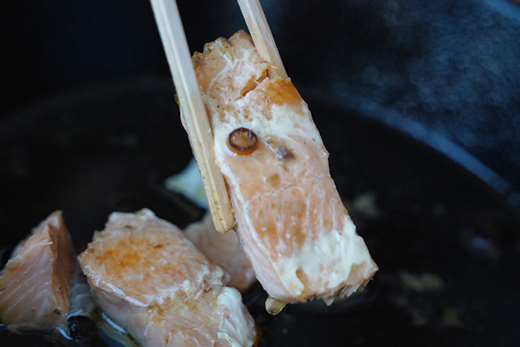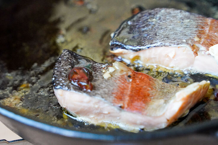さっそく、熱したフライパンに、ニジマスの切り身とオイルを全部のせ!