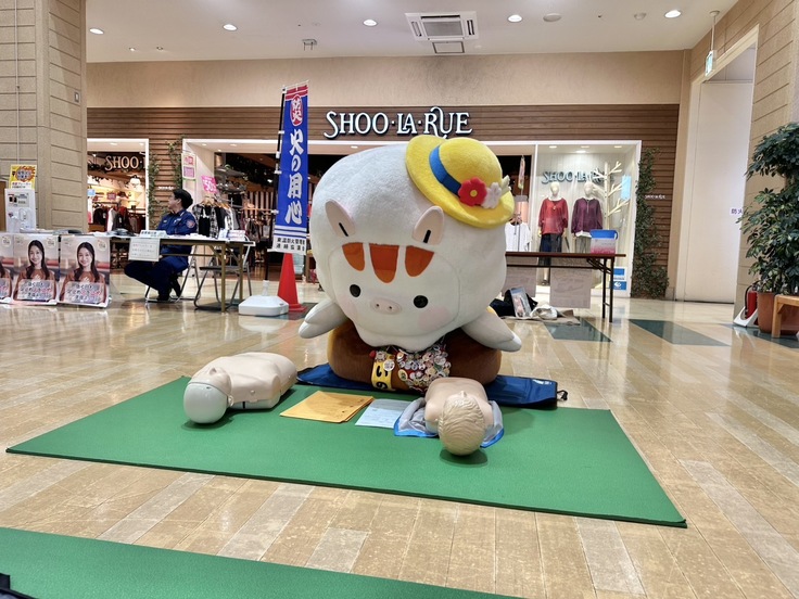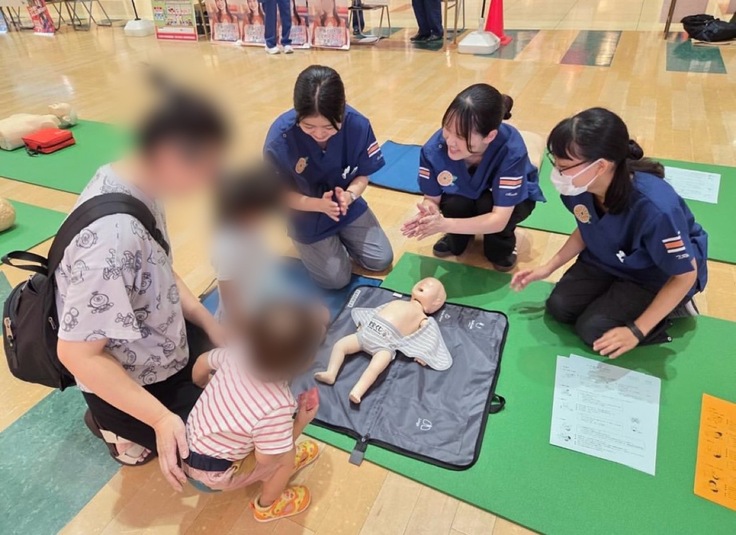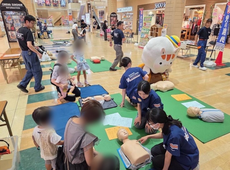 東温消防の皆さまとご一緒させていただき、来場された方に心肺蘇生を体験していただくコーナーを担当。
