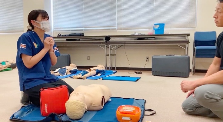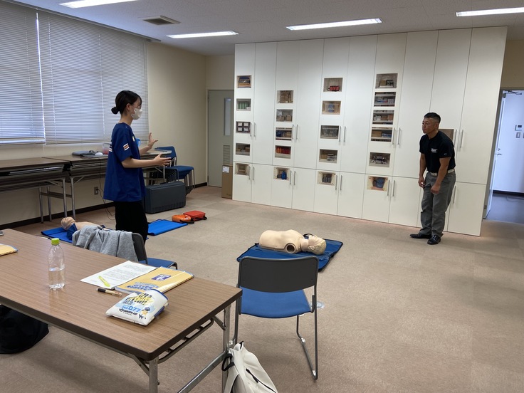 普段色々な所でご指導をされている救命士さん達から、伝わる説明の順番、声の掛け方、デモの見せ方など、“BLSを教える”上でのポイントを実践形式でたくさん教えていただきました。