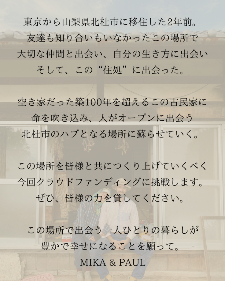 この度、本プロジェクトを応援してくださる皆様と一緒にこの場所を作り上げるべく、初めて夫婦でクラウドファンディングに挑戦します!私たちのチャレンジに、皆様の力を貸してください。ぜひ応援よろしくお願いいたします!