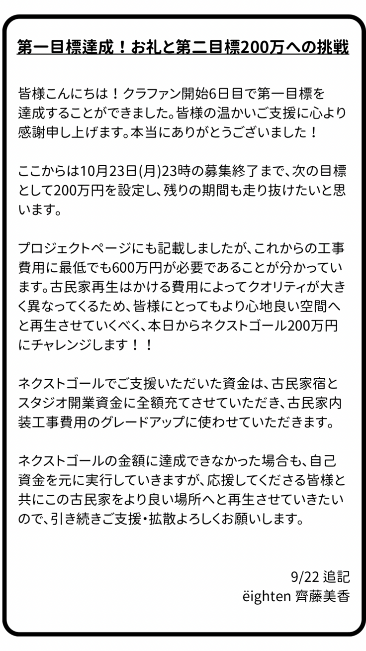 実行者が古民家を改装し、宿兼スタジオをオープンする。資金は全て改装費に充当する。
