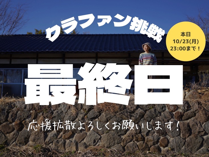 クラファン挑戦、本日最終日!!!10/23(月)23:00まで!!!