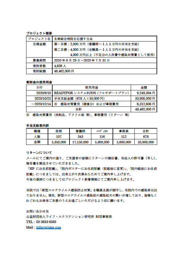 当院OBの共同代表の医師の方々(あさくさ田原町内科クリニック 院長 阪口真之先生、上野なかのクリニック 院長 中野邦夫先生、医療法人社団KDE上野浅草通りクリニック 院長 鴫原寿一先生)が「永寿総合病院を応援する会」のクラウドファンディングを立ち上げて下さり、プロジェクトに共感いただいた多くの皆様から第二目標を上回る49,462,000円ものご支援をいただき、READYFOR様から入金されました。