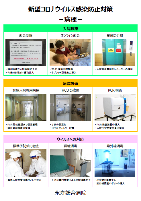 再開後、絶対に院内感染を再発させないという全職員の決意の下、できる感染防止対策は全て採用しながら徐々に従来の全ての診療機能を回復させてまいりました。積み上げてきた感染防止対策により、院内での感染は 1 例も確認されておらず、安心して受診していただける体制を提供できるよう職員一人一人が心掛けております。