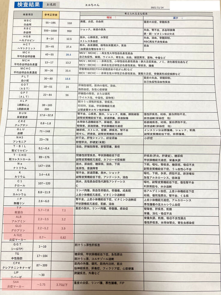 今回も経過はとても良好ということで、総蛋白とA/G比、炎症マーカーともに基準値の範囲内でした。
