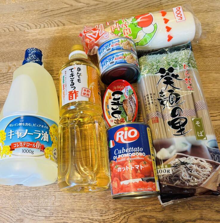 ・ツナ缶×2・いわし缶・カットトマト缶・そば
