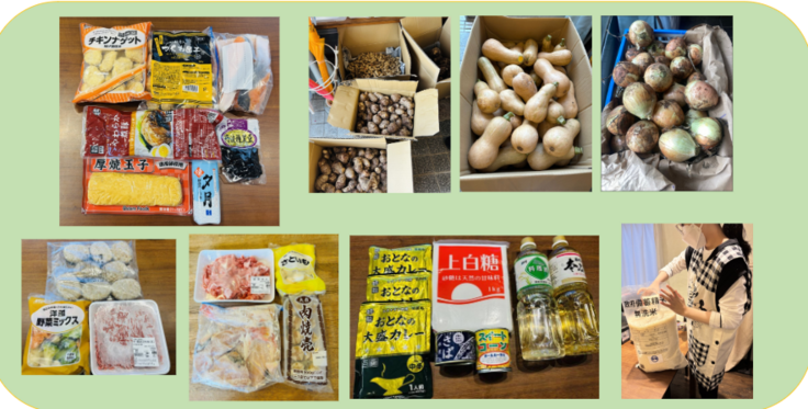 油、醤油、味噌等々、日常的に使う食品はとても助かりました。レトルトはストックさせてもらい、体調の悪いときや時間のないときに活用させてもらいました。また、普段買わない嗜好品はもらって嬉しかったです。