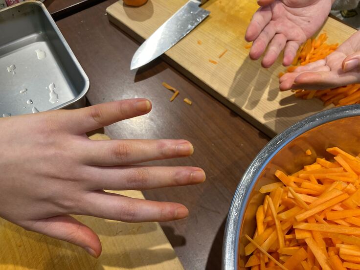 1時間ほど時間をかけてじっくり切り込みしてくれました。頑張った証に、手がオレンジ色になっていました。