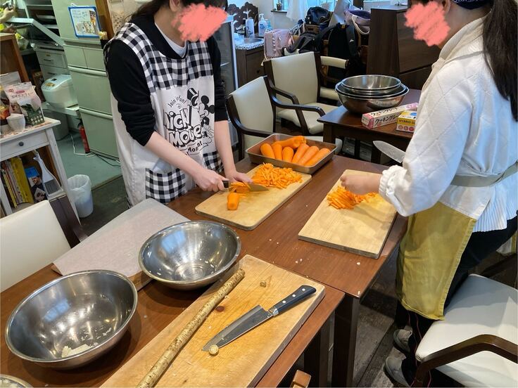 第3第4土曜日の食堂では、ブリュッケ(かわさき若者就労・生活自立センター)の若者たちがお助け隊として一緒に調理に入ってくれています。この日はつくねとサラダに根菜が多く入るため、硬い人参を小さく切ることに挑戦。