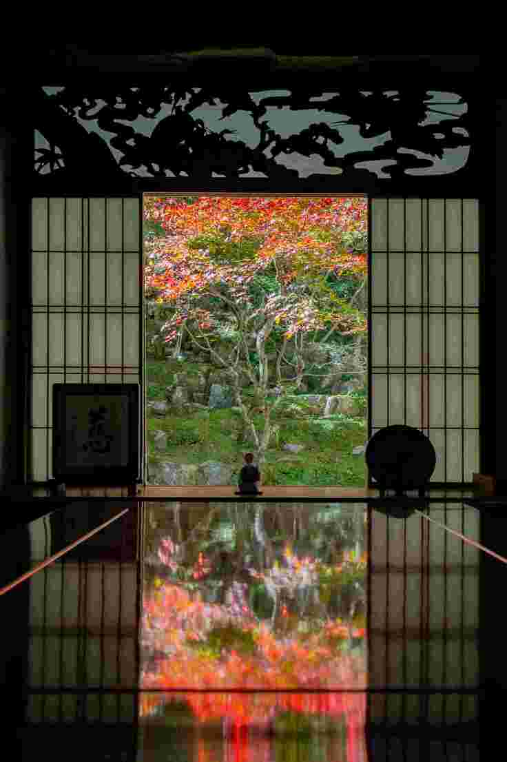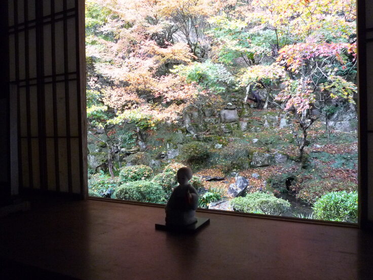 床の間の「無事是貴人」野紺菊 慧日寺の花頭窓より冬もみじ