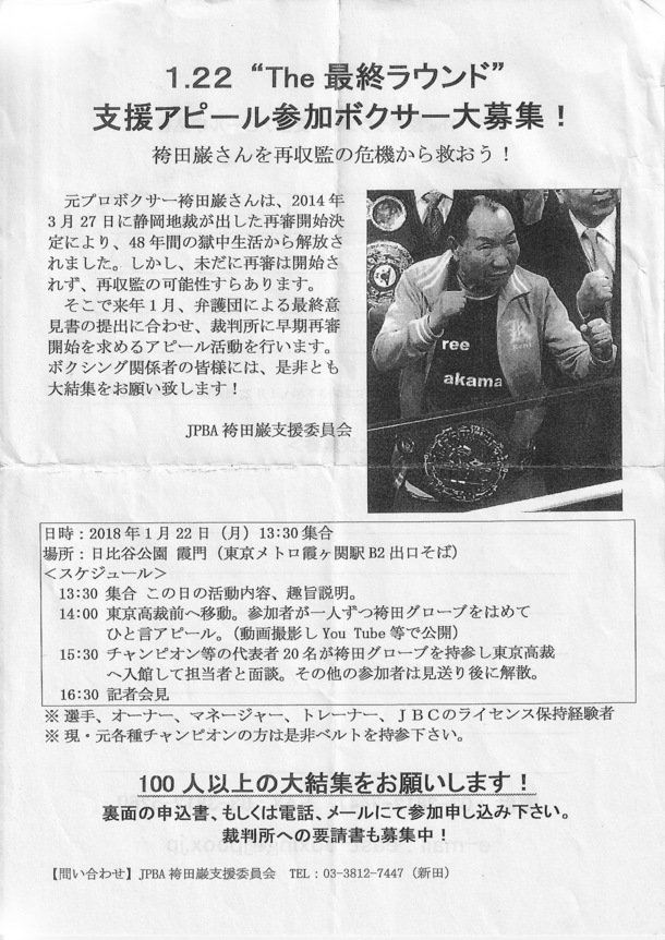 元プロボクサー袴田巖さんは2014年3月に仮釈放されましたが、いまだ殺人犯の汚名を着せられています。来年1月、弁護団による最終意見書の提出の合わせ、100人のボクサーを集めて東京高裁前で早期再審開始を求めるアピール活動を行います。再審開始が決定されなければ最終巻の可能性も。これだけは何としても食い止めなくてはいけません。
