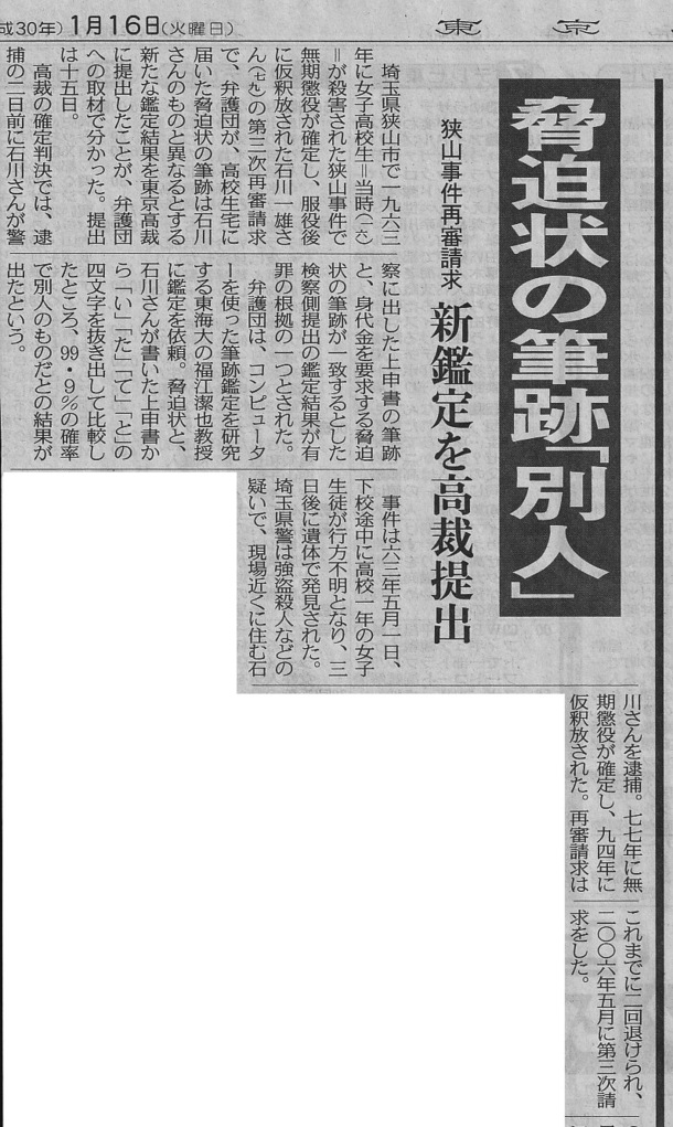 石川一雄さんは54年も無実を訴えている人です。半世紀! 被差別部落出身だった石川さんは逮捕当時、字が書けませんでした。だから脅迫状を書けたはずがないのです。取り調べで、脅迫状の文字に似せた文字を書くよう強要されました。しかし、文字の書けなかった石川さんにそれは難しかった。脅迫状の文字と石川さんの筆跡は明らかに違うという新鑑定が出ました。(下記は東京新聞2018/1/16夕刊)