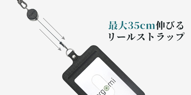 掴んで引っ張ると最大35cmまで伸びる伸縮性のあるリールにより、カードホルダーを背一杯引っ張っても簡単にすばやく引き戻ります。
