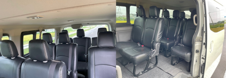一台はトヨタハイエースワゴン(10人乗り)、もう一台は日産キャラバンワゴン(10人乗り)の2台です。