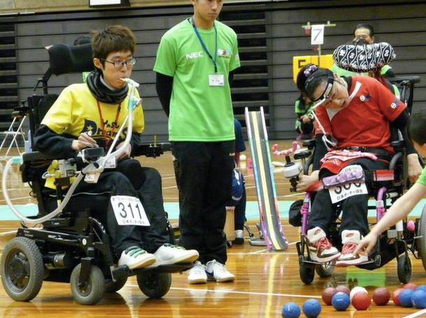 ルールはシンプルで、ジャックボールと呼ばれる目標球に、自分のカラーボール(赤または青)を投げたり、蹴ったり、転がしたりして、いかに近づけられるかを競う競技です。障害の程度によって、BC1~BC4のクラスに分かれています。 私は、中でも、最も重い障害のある選手たちのクラスであるBC3クラスです。