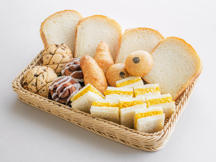● 内容 塩ソイバタール2個、アールグレイ白あんパン2個、クルミのシナモンロール2個、まるでたまごサンド2個、スライス食パン4片、腹黒メロンパン2個