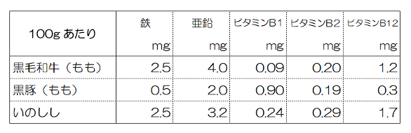 いのしし肉は「良質なたんぱく質」を含み、その他鉄や亜鉛、ビタミンB群も豊富に含まれている栄養価の高い食材です。