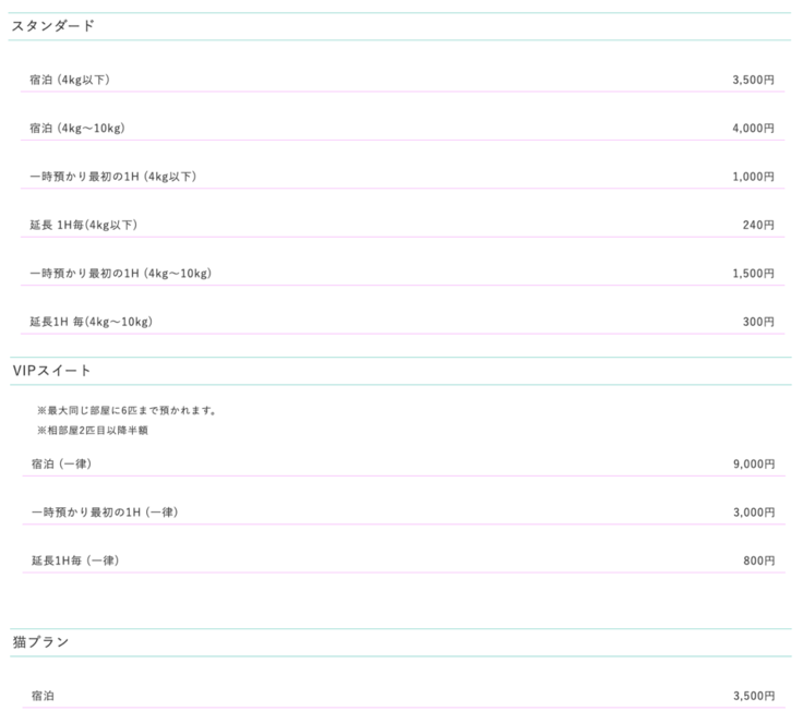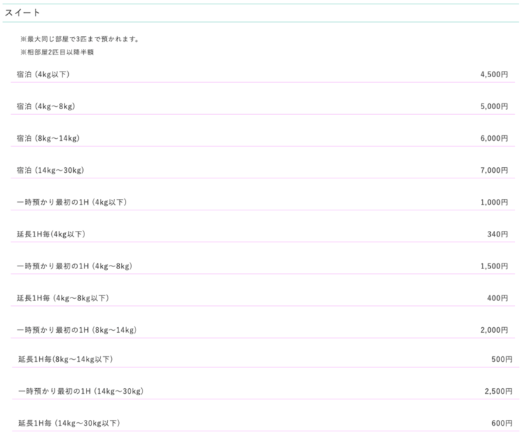 ペットたちが安心して過ごせるよう、完全個室のお部屋を3タイプご用意しています。スタッフも24時間常駐しており、提携している24時間体制の動物病院もすぐ近くにあるため、万が一何かあった場合も迅速に対応可能です。