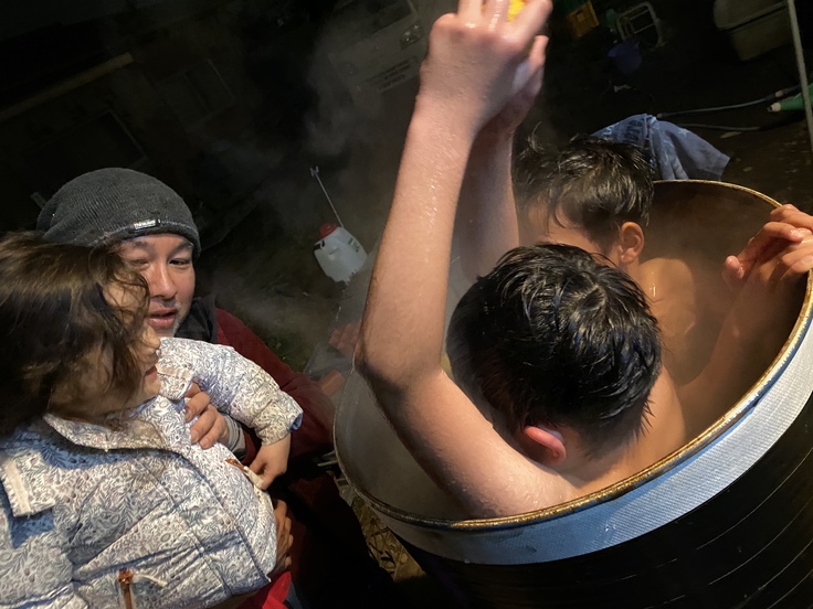 (篠塚さんお手製ドラム缶風呂にはしゃぐ子供たち)