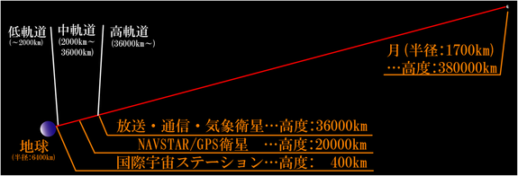 また、現在の社会では世界各国の機関や民間企業が沢山の人工衛星を運用しています。これらの衛星を高度で分類すると、高度2000 km未満の「低軌道」、2000~36000 kmの「中軌道」、36000 kmより上の「高軌道」に分けることができます。特に、高度36000㎞の静止軌道は、気象衛星「ひまわり」や、衛星放送、国際中継などで利用されているので、日常生活の中でも使う機会は多いのではないでしょうか。