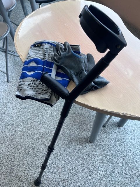 杖、ゴム付きの作業用手袋、ヒンジ入り膝サポーター、これ私の生活必需品です。