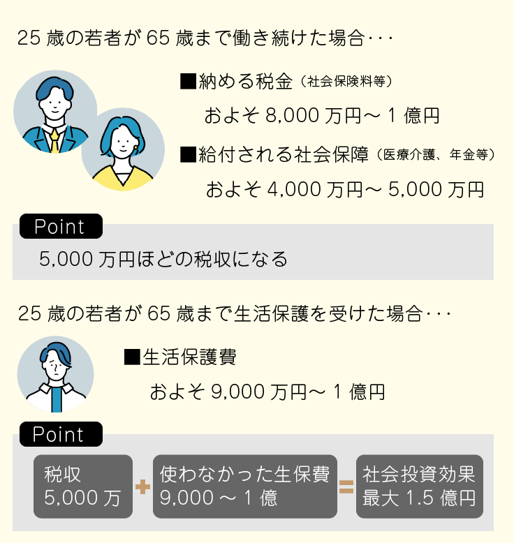 「社会参加」や「経済的な自立」が実現されればその方は納税者となり、社会を支える側の存在になります。個々人が望んだ人生を歩むことができるようになり、さらに社会がよりよい方向へ進んでいくことができます。