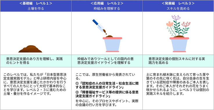 南オーストラリアでモデルを開発し世界会議でも優れた実践として評価された意思決定支援の第一人者であるシェア・ニコルソン氏や、スコットランド・スターリング大学において研究開発され、世界各国において使用される英国式意思決定支援ツール「トーキングマット」の創始者であるロイズ・キャメロン氏などから、実践的な意思決定支援のためのスキルや指導方法を学び、同氏らから認められたトレーナー達が、意思決定支援実践のための総合プログラムを開発し、提供しています。