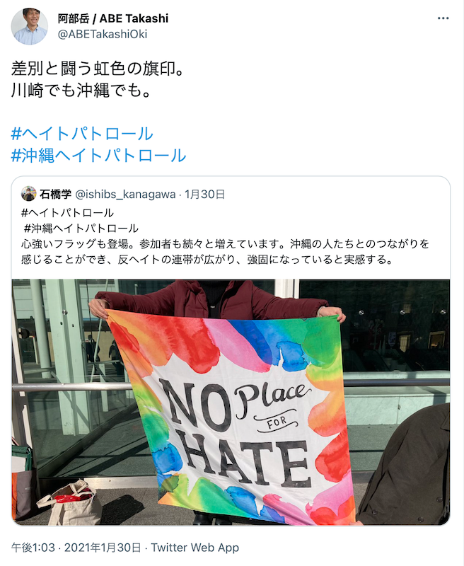 「まるで民から官まで沖縄ヘイトに染め抜かれている」、阿部さんはそう表現していました。そのことばには、日本人としての「傍観することの罪深さ」や、「社会の無関心によって「ヘイト」が許されてしまっている現状への危機感」が込められているようでした。