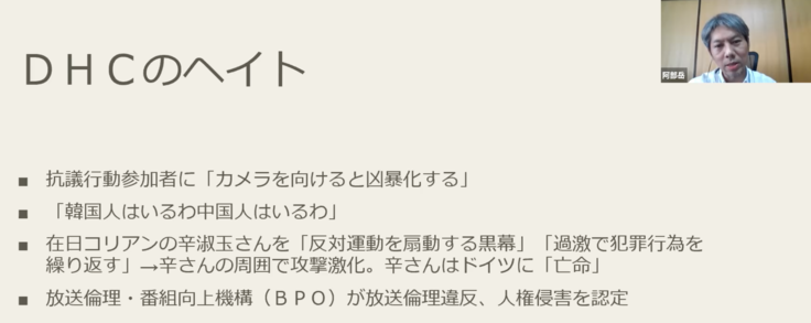 辛淑玉さんが、制作元の「DHCテレビジョン」(当時は「DHCシアター」)と、番組で司会を務めた長谷川幸洋氏(当時「東京新聞」論説副主幹)を、名誉毀損だとして訴えた裁判の証人尋問を傍聴した阿部さんの報告で、一番ショックだったのは、これだけの想像を絶する被害を被った辛淑玉さんが、番組プロデューサーと長谷川氏との3人でいっしょに宣誓文を読まされたという話です。裁判所のあまりの配慮の無さに、しばらく信じられませんでした。あり得ないと思いました。