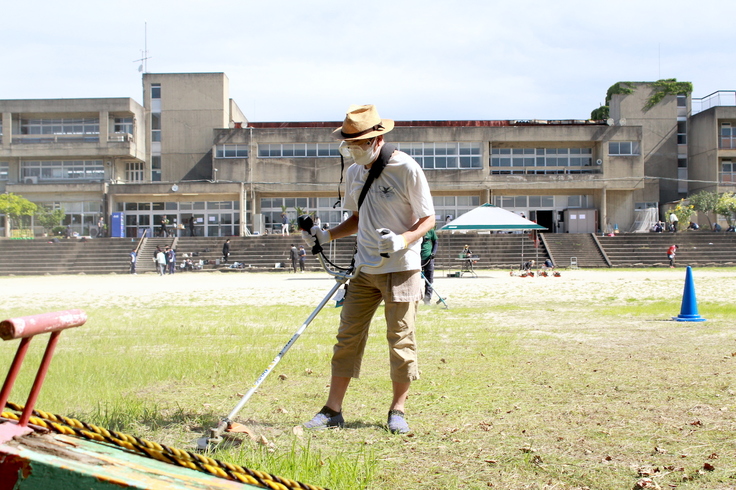 朝からの作業で、あちこちに山と積まれた雑草や木々の枝が、次第に一箇所に集められ、それをさらに回収していくトラックがグラウンドを頻繁に往来し始め、美化活動はいよいよ佳境へ。
