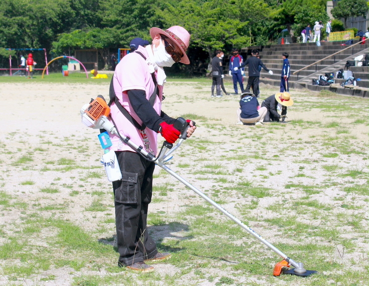 グラウンドのあちこちから、草刈り機の土煙が立ち上ります。その向こうに、ピンクの帽子とポロシャツが霞んで見えます。あれは、朝鮮学校のお隣りの学校、立花高等学校の齋藤校長先生ではありませんか。