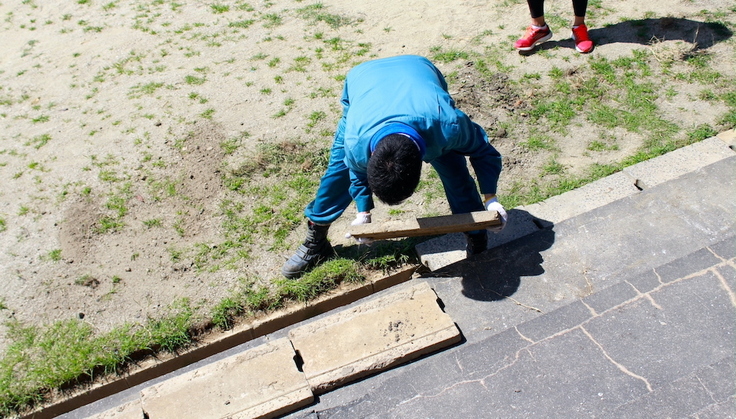 7月18日の日曜日。今回初参加の、中学生・小学生の子どもたちを3人連れて、福岡朝鮮初級学校の美化活動に参加しました。