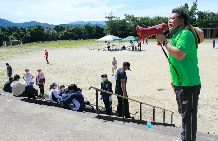 粘り強く最後の最後まで責任持って回収作業を続けてくれた立花高校の生徒さんたちが、グラウンドの向こう側から駆け足で寄ってくる姿に対し、写真撮影を待って並んでいる一同から自然発生的に拍手が起こりました。「お疲れ様」「最後までようがんばったね」という無言のエールが送られているのがはっきりと伝わってきて、なんとも温かい気持ちになりました。