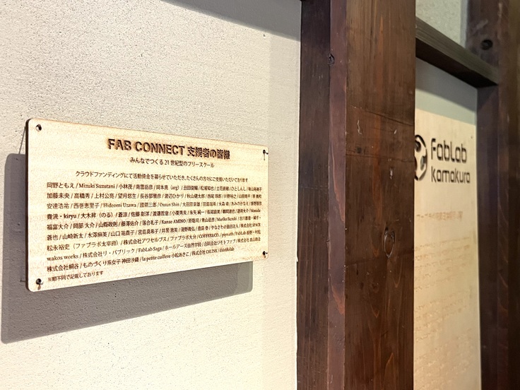 たくさんの方々にご支援いただいたことをファブラボ鎌倉に来ていただいた方にもご覧いただけるよう、施設内に支援者の皆様よりいただいた氏名や会社名を掲載しております。