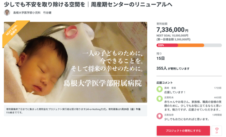 「少しでも不安を取り除ける空間を|周産期センターのリニューアルへ」プロジェクトの成功を心よりお祈りしております。皆様、ぜひプロジェクトをご覧いただき、ご支援、ご協力をお願いいたします。
