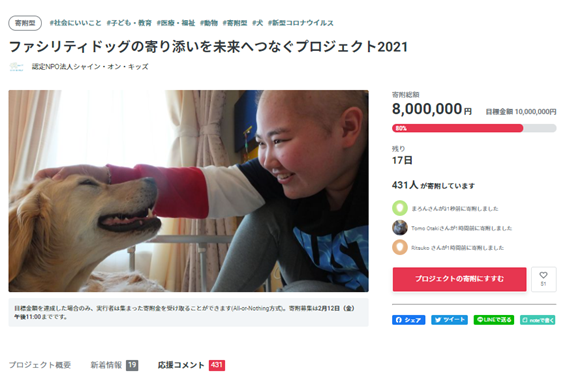 あと一歩、ファシリティドッグのことを知らない方にも情報が広がればと思っております。可能でしたらシェア等で多くの方に広げていくために、お力を貸していただけますと幸いです。