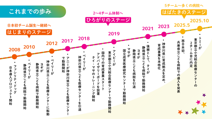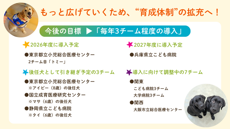約5年間、ファシリティドッグは4チームの活動でしたが、来年から再来年にかけて複数チームがデビューを予定しています。