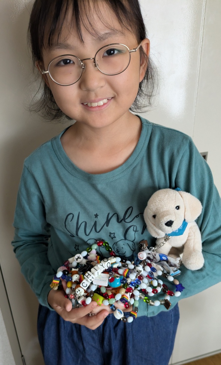 少し前から、治療の経過をたどってビーズでつないでいく「ふりかえりビーズ*****」プログラムに参加するようになりました。点滴、検査、移植手術など、いろんな種類のビーズを少しずつつないでいくと、今まで受けてきた治療のことをよく理解できるし、「こんなに頑張ったんだな」と自分に自信が持てて、誇らしい気分になれます。中には、犬のビーズもあるので、マサと過ごした想い出もビーズにつないでいます。