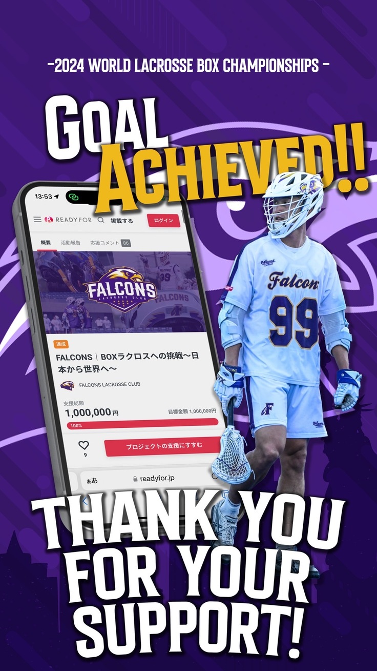 夢に向かって全力で挑戦し続けるFALCONS、そして日本ラクロスの未来のために、今後とも変わらぬご支援をどうかよろしくお願い申し上げます!