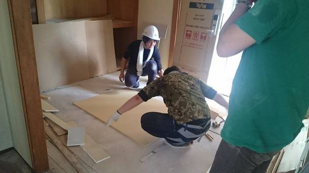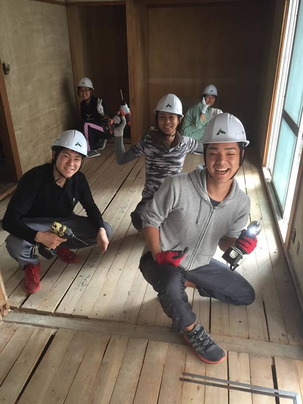 猛暑の中、学生ボランティアさん達は元気に大工の指導を受けながら、