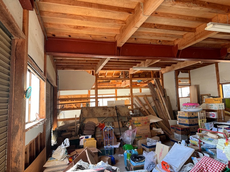 作業所の壁が落ち、地面や柱が傾きシャッターも破損して開きません。(引き続き使用可能か調査待ちの状態です)