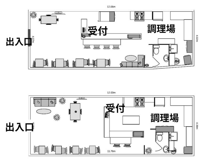 下調べをした空き店舗二件での間取り図を作成してみました。約坪8と約15坪の広さで、カウンター席とテーブル席を設ける予定です。内装はシンプルで清潔感のあるなかに和を感じる小物を飾りたいと思っています。