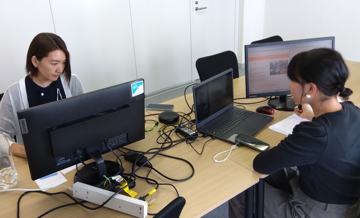 インタビュー時の様子(インターン生 川田と事務局スタッフ 吉田)