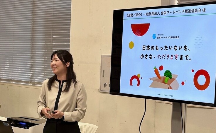 体験会の後半では、全国フードバンク推進協議会の活動紹介として、事務局の有松が登壇しました。