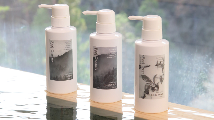 具体的には、北上川からの霧が育てた杉の間伐材から抽出した天然精油を配合したシャンプー、トリートメント、北限の雪中茶の端材をエキス化し配合したボディソープ。合成の香りを一切使用せずに、私たちが大切にしている天然の香りのみで仕上げ、極上のバスタイムをお届けします。