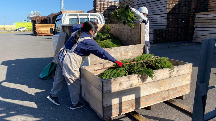 宮城県登米市に位置する森林組合、米川生産森林組合。登米杉はFSC国際認証を取得するなど宮城を代表する建材のひとつです。そこで管理された杉の間伐材はそのままにしておくと水害や災害につながる原因となります。このプロジェクトでは杉の未利用杉枝葉の間伐材をご提供いただき、スタッフが手作業で選別と移動を担っています。