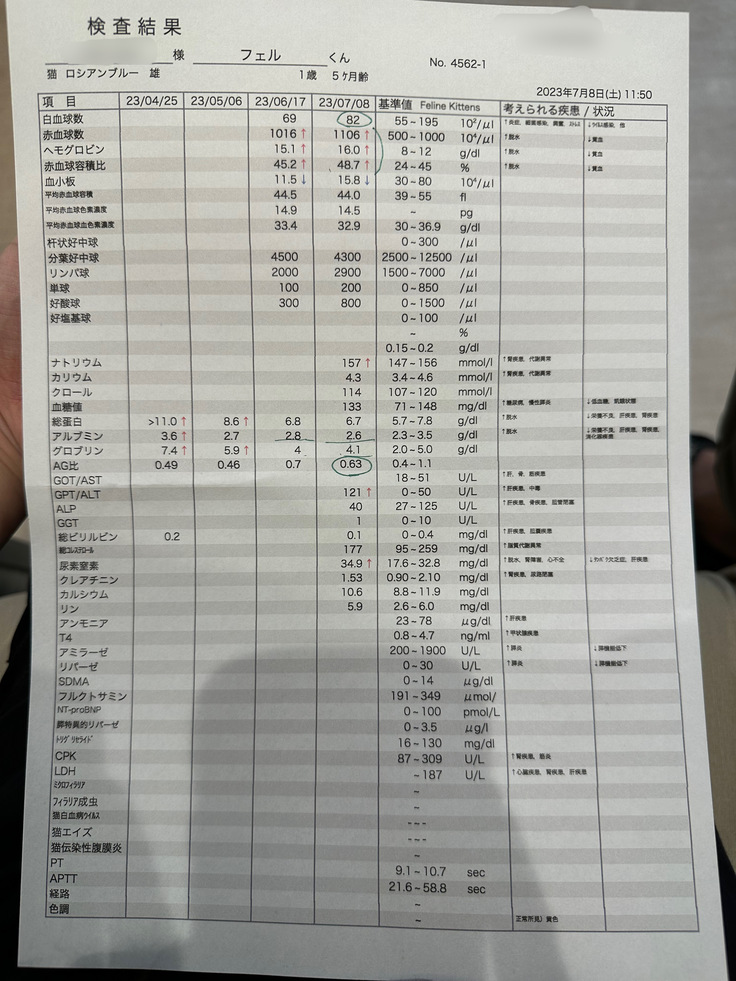 血液検査の結果、前々回と比べると少し数値は劣るものの数値の波形が基準値内に戻り投薬終了となれました。