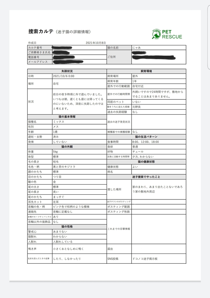 しかし、失踪してから時間が経った今、早くにゃあを見つけ出すために、プロの方々に捜索に来ていただきたいのです。