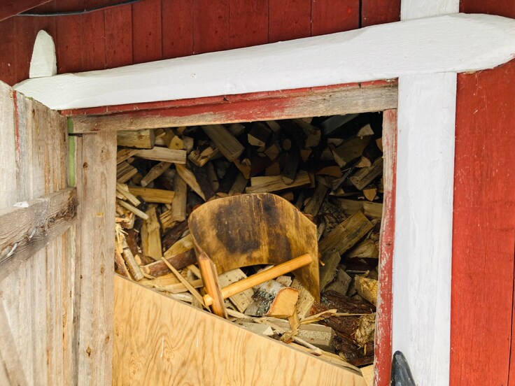 工房を後にする頃、古い家屋の脇に建っている赤い建物が気になり見せてもらうと、なかには薪の木がぎっしりと詰まっていました。木が身近な暮らしには薪ストーブがあり、なんだかほっとしますね。それにしてもこんなにたくさんの薪が入っているとは想像していませんでした。