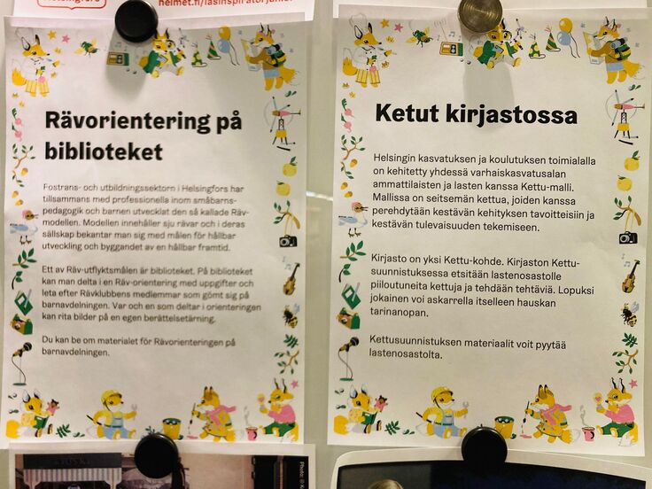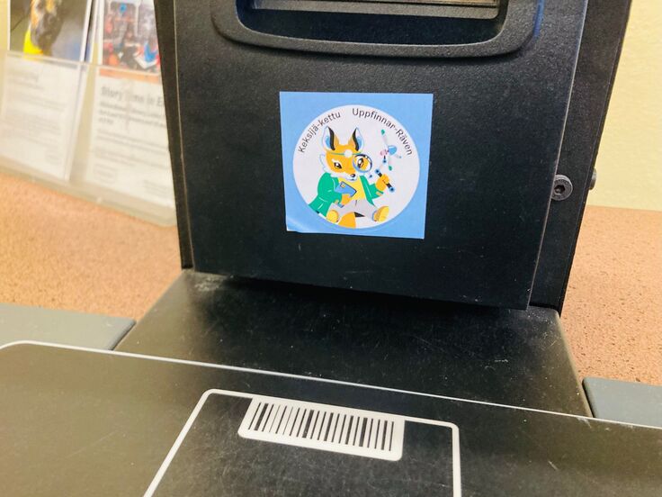 キッズスペースの前にあったこのキツネの貼紙が気になり、フィンランド語もスウェーデン語も自分では解読できなかったので、図書館の司書の方に内容を聞いてみました。すると、これは子どもたちのアクティビティで、子どもたちは図書館内に隠された7つのキツネの貼り紙を探そうです。それらは、それぞれ関連するカテゴリの本棚や施設のものに近いところに貼られており、子どもたちが今世界にある問題とそういった分野がどういうふうに関わっているかを考えるきっかけになればと、各図書館で今年初めから始まったのだそうです。